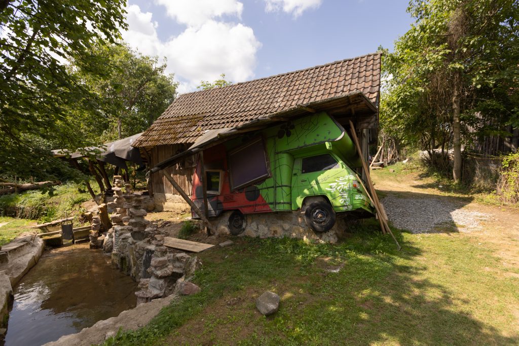 Als die AZ das alternative Universum betritt, ist gerade Bauzeit. Lily Lu fräst mit einem Fadenmäher durch die Wildblumen hinter dem Bauernhaus. Über den Bach, der durch das Landstück hinter dem Haus fliesst, soll eine Brücke entstehen, erklärt sie. Eine Wand des Grabens hat sie mit umgekehrten Grabsteinen ausgeschmückt. «Damit würde ich gern noch mehr ausprobieren», erzählt Lily Lu, «aber Grabsteine findet man halt nicht überall».