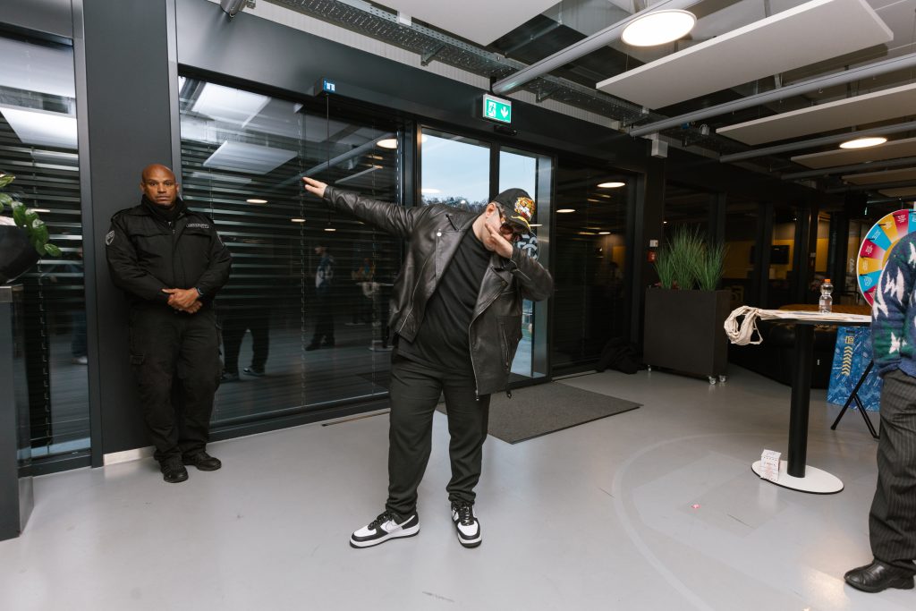 Steve Merson macht einen Dab für die Kameras. (Der Dab ist eine Tanzfigur aus dem Jahr 2015, bei der der Kopf nach unten sinkt und ein Arm hochgehoben wird.) Foto: Robin Kohler