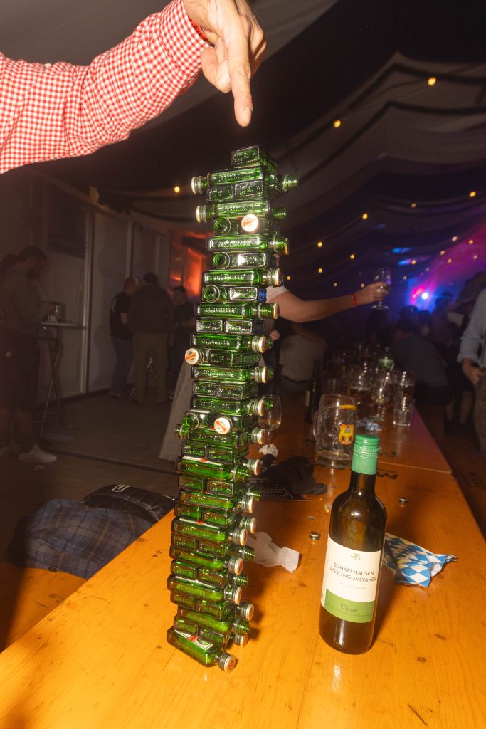 Insgesamt ist die Übertragung des Münchner Originals auf Schaffhausen durchwachsen, mehr Schein als Sein. Aber dieser Schein zählt. Als ich zwei weitere Frauen frage, warum sie heute hier sind und ein Dirndl dafür tragen, geben sie irritiert zurück, das gehöre einfach dazu, es sei Oktoberfest. Vermutlich liegt genau darin die Wirkmacht des Fests: Es muss weder erklärt noch in Schaffhausen verankert werden, sondern ist soziales Theater, das die meisten einfach mitspielen können. Und der Tiefgang, den ich hier suche, liegt bestenfalls am Boden des Masskrugs: Insgesamt gehen an den drei Tagen gemäss Veranstalterin 2480 Liter Bier über die Theke.